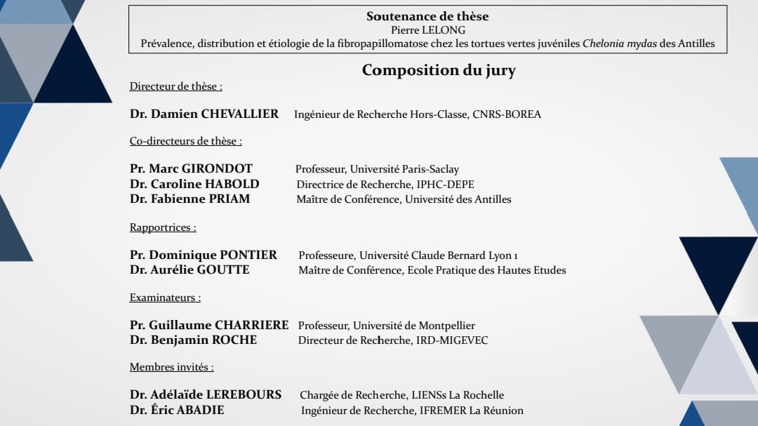 Travaux réalisés sous la direction du Damien Chevallier (ingénieur de recherche, HDR, CNRS), et co-direction de Marc Girondot (Professeur des universités, Université de Saclay), Caroline Habold (Directrice de recherche, Institut pluridisciplinaire Hubert-Curie) et Fabienne Priam (Maître de conférences, Université des Antilles).